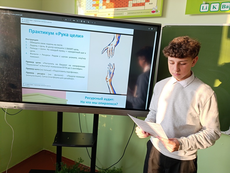 12 января в 9 классе прошел классный час «Мое психологическое благополучие» на тему «Я в действии: стратегия личного роста». В ходе мероприятия ребята узнали о том, как превращать мечты в реальные планы, как становиться лучше и увереннее. Познакомились с понятием -  стратегия личного роста. Ребята убедились, насколько важно определять жизненные цели. В игровой форме девятиклассники учились оценивать ситуации, требующие баланса между риском и осторожностью («мотивация достижения успеха» или «мотивация избегания неудачи»), пробовали адекватно реагировать на нее. Отрабатывали навык переформулирования абстрактных желаний в конкретные, измеримые и ограниченные по времени задачи. Ребята убедились, что в целеполагании важны и амбиции, и трезвая оценка рисков.