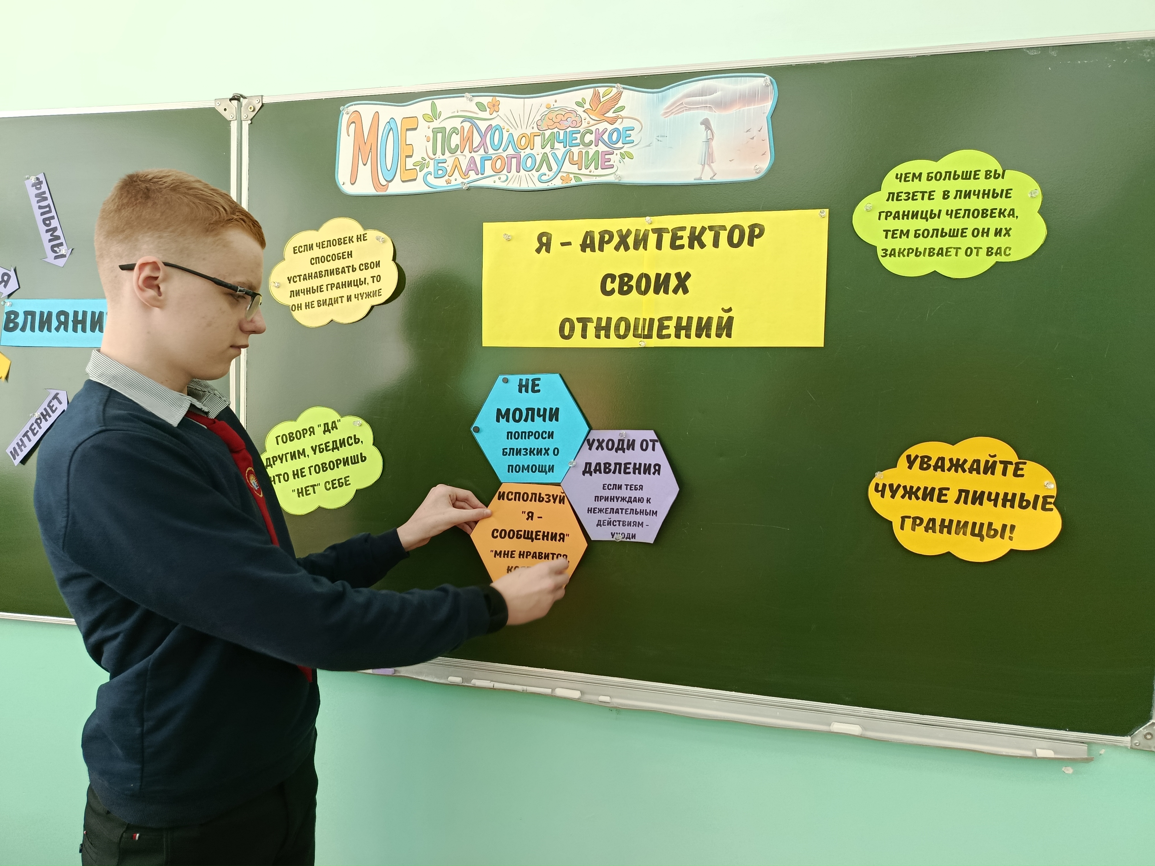 9 февраля в 7 классе прошёл классный час "Моё психологическое благополучие" по теме "Я - архитектор своих отношений". Главной темой стала идея о том, что каждый из нас сам "проектирует" своё общение и выстраивает личные границы. Мероприятие прошло в формате живого диалога: ребята обсуждали такие понятия, как границы, влияние, учились говорить убедительное "нет" и лучше понимать друг друга. Это была отличная возможность поговорить о важном, поделиться мыслями и попрактиковаться в поддержке.