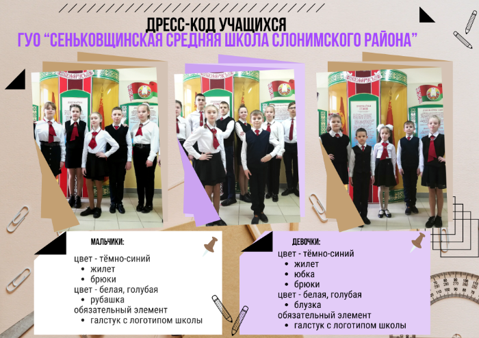 Уже в текущем учебном году для всех учащихся нашей школы введен деловой стиль одежды с единым отличительным элементом в виде значка с логотипом учреждения. С 2025/2026 учебного года школьники будут посещать учебное заведение в обязательной школьной форме тёмно-синего цвета.