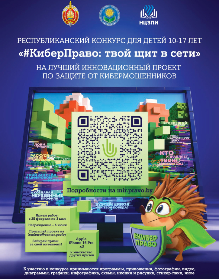Стартует республиканский конкурс для детей на лучший инновационный проект по защите от кибермошенников «#КиберПраво: твой щит в сети» Мероприятие направлено на повышение цифровой грамотности подростков и развитие культуры безопасного поведения в интернете. Организаторы: МВД, Минобразования, Национальный центр законодательства и правовой информации. Для ребят участие в конкурсе — отличная возможность проявить свои идеи и помочь сделать сеть безопаснее для всех! 🔹Кто может участвовать? Возрастной критерий участников — от 10 до 17 лет. Каждый может представить только одну авторскую работу. Коллективное авторство не допускается. 🔹 Что нужно сделать? Разработать инновационное решение для противодействия кибермошенничеству. Это может быть приложение, видеоролик, инфографика, программное обеспечение и др. Обязательно — использовать хештег #КиберПраво и соблюдать авторские права. 🔹Сроки и награды Приём работ — до 3 мая включительно. Лучшие 30 участников пройдут в финал, где их ждут дипломы, подарки и ценные призы. Среди них — айфоны, VR-очки, беспроводные наушники, умные часы и многое другое! 🔹 Как подать заявку? Заполните регистрационную форму и отправьте работу на konkurs@center.gov.by. Если объем файла превышает 10 МБ — загрузите его в облако (Google Диск или Яндекс.Диск) и пришлите ссылку. Все подробности смотрите, читайте, изучайте на Детском правовом сайте 🔴