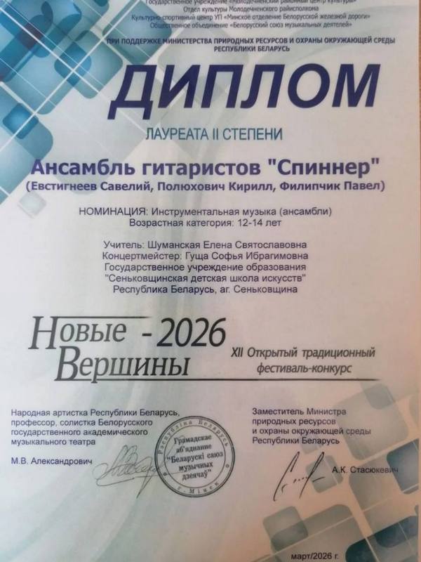 В г. Минске прошёл XII Открытый традиционный фестиваль - конкурс "Новые Вершины - 2026", учащиеся ГУО"Сеньковщинская детская школа искусств" Евстигнеев Савелий, Полюхович Кирилл и Филипчик Павел, в составе ансамбля гитаристов "Спиннер" ( учитель Шуманская Елена Святославовна, концертмейстер Гуща Софья Ибрагимовна) достойно представили свою школу и были награждены дипломом Лауреата II степени. Поздравляем и желаем новых творческих успехов.