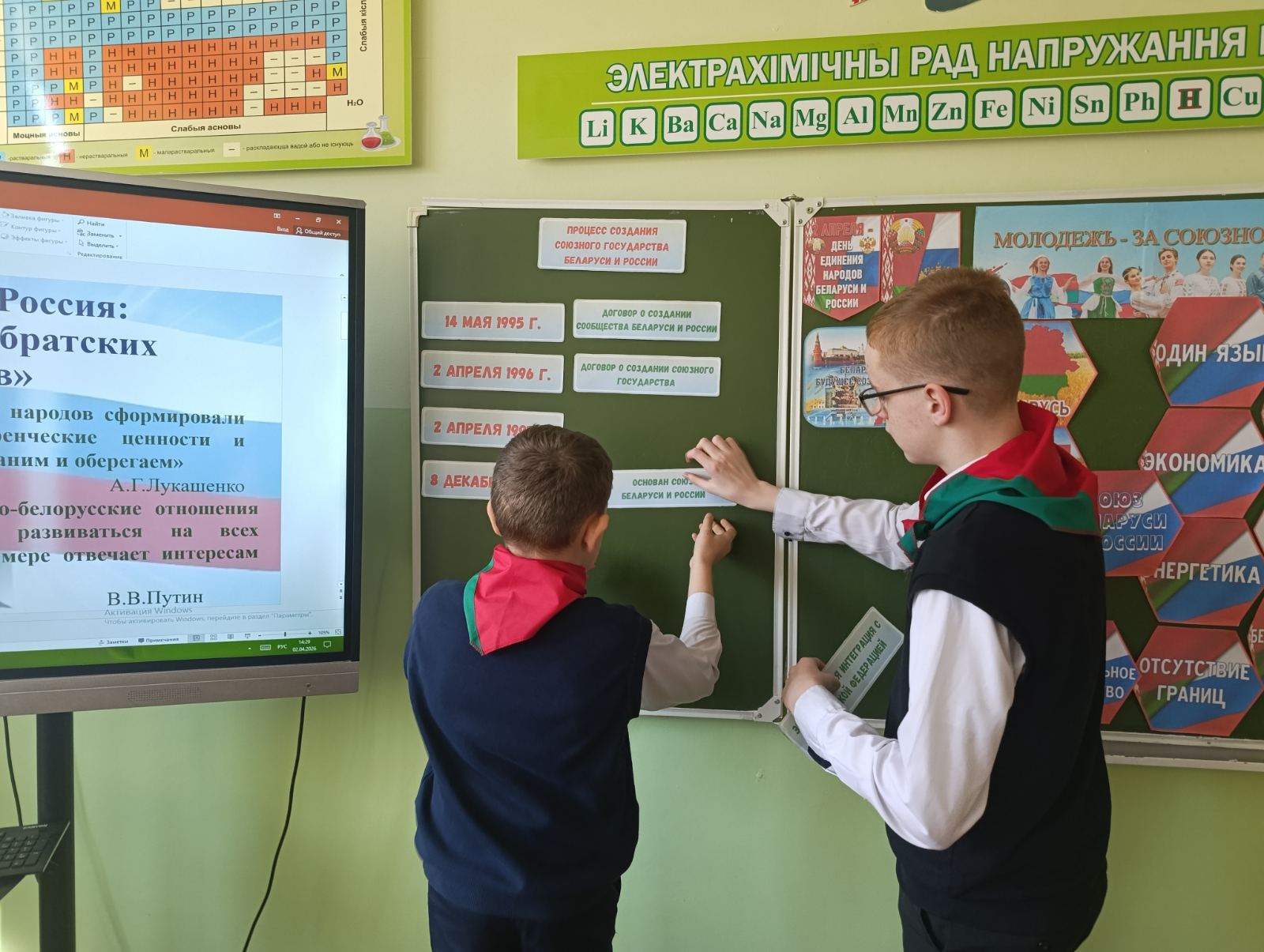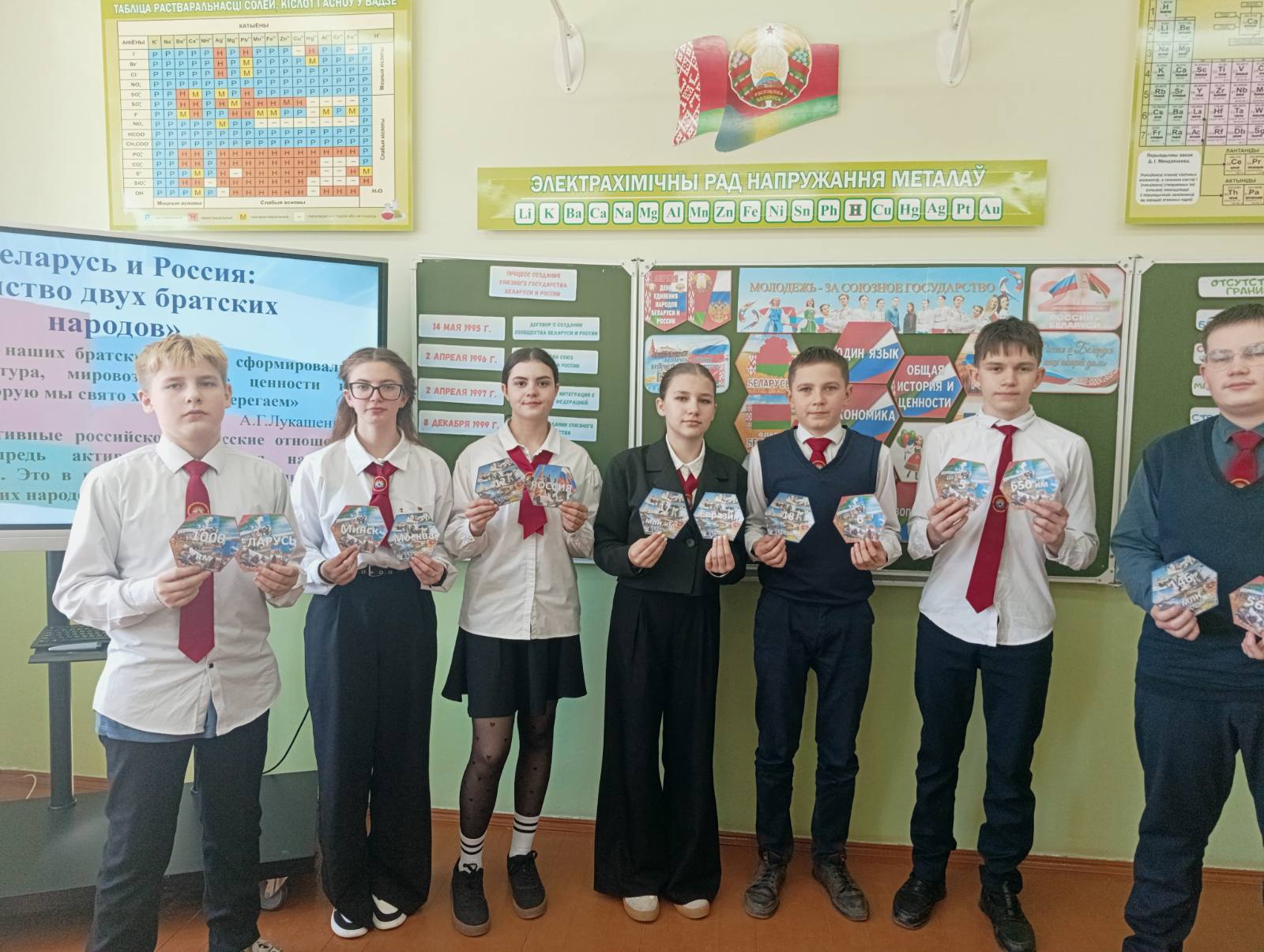 2 апреля в нашей школе прошел единый урок «День единения народов России и Беларуси», который был организован для учащихся 5–9 классов.В ходе мероприятия учащиеся познакомились с интересным и познавательным информационным материалом: узнали об общем историческом пути, о традициях, обычаях и богатстве обоих народов, выяснили, какие проекты объединяют нашу молодежь сегодня. Особое внимание было уделено исторической дружбе и сотрудничеству Беларуси и России, а также важности сохранения культурного наследия. Одной из увлекательных частей урока стала командная работа. Ученики собирали пословицы, отражающие дружбу, взаимопонимание и единство народов, складывали гексы, синквейн, активно приняли участие в блиц-викторине. Ребята пришли к главному выводу: вместе мы сильнее!