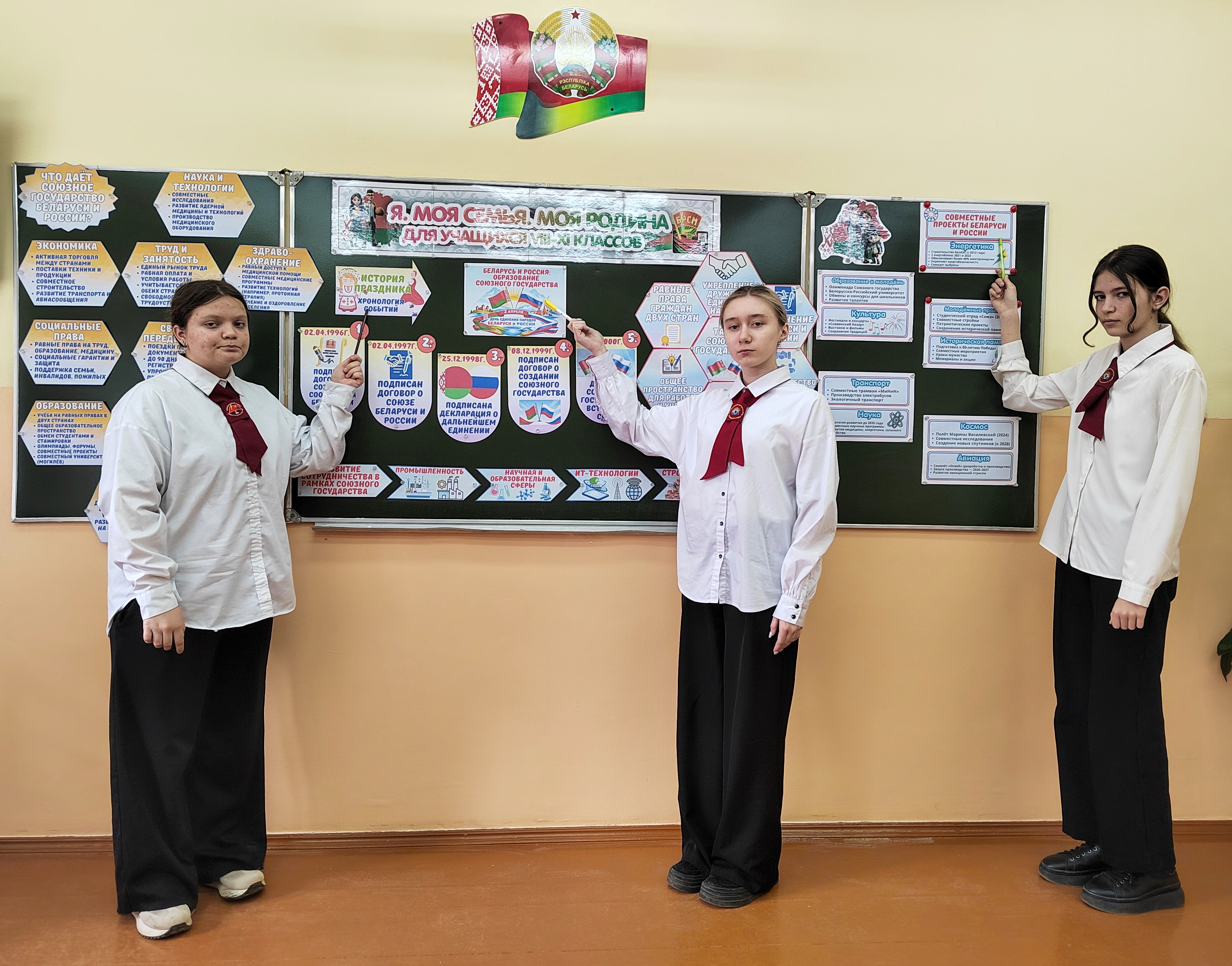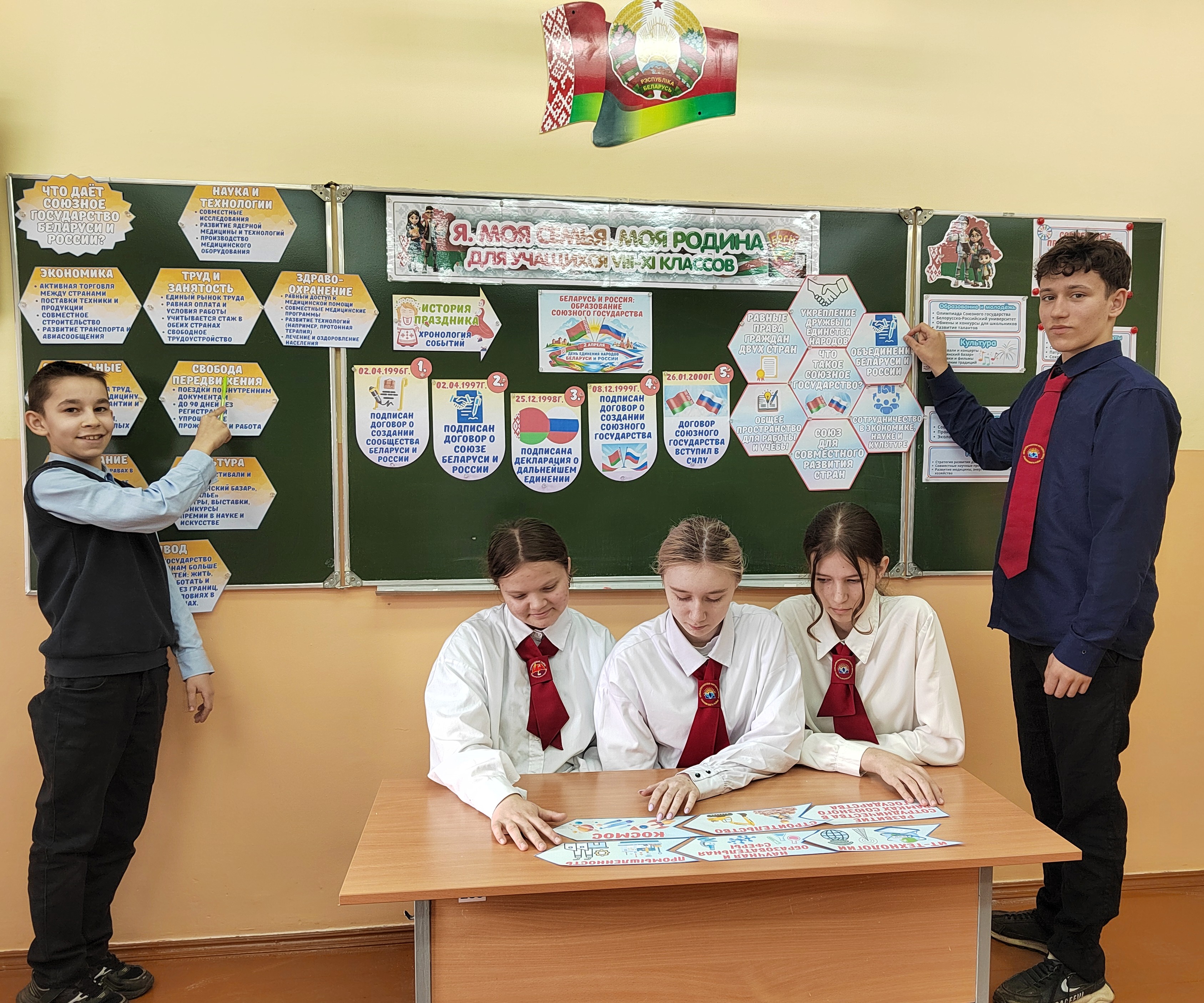 13 апреля 2026 года для учащихся 8 класса прошло очередное занятие «Беларусь и Россия: история становления и развития Союзного государства» в рамках программы «Я. Моя семья. Моя Родина». Мероприятие прошло в форме диалога и способствовало формированию у учащихся представления об истории становления и развития Союзного государства Беларуси и России, о том, что дает Союзное государство гражданам двух стран; о молодежных проектах Союзного государства. Данные занятия способствуют воспитанию у учащихся чувства патриотизма, уважения к истории и понимания важности союзных отношений между Беларусью и Россией.